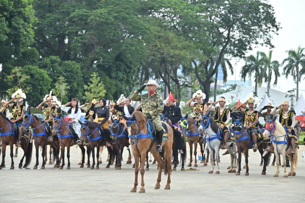 Acara penetapan di Monas diakhiri dengan pertunjukan ketangkasan oleh Komponen Cadangan Berkuda yang baru ditetapkan. (Biro Infohan Setjen Kemhan)