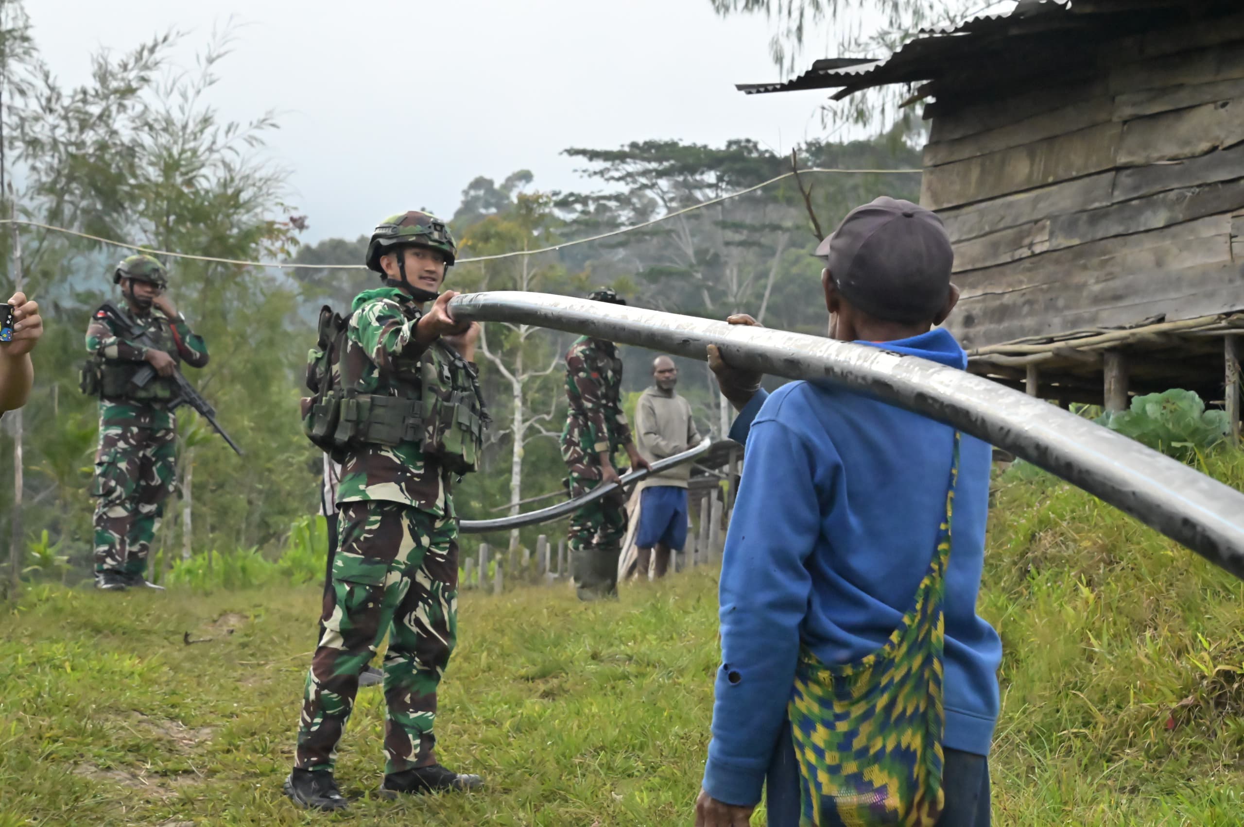 Di lapangan, Koops Satgas Swasembada Batalyon Infanteri 751/VJS melaksanakan pembangunan fasilitas air bersih untuk memenuhi kebutuhan dasar masyarakat di tiga desa wilayah Distrik Okaom, Kampung Bulangkop, Kabupaten pegunungan bintang, Provinsi Papua papua pegunungan.