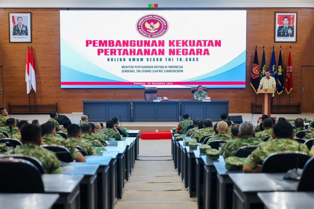 Bandung – Menteri Pertahanan RI Sjafrie Sjamsoeddin memberikan motivasi serta pembekalan strategis kepada Perwira Siswa Dikreg LIV Sesko TNI TA 2025 di Kelas Ghra Widya Adibrata, Sesko TNI Bandung, Selasa (25/11/2025).