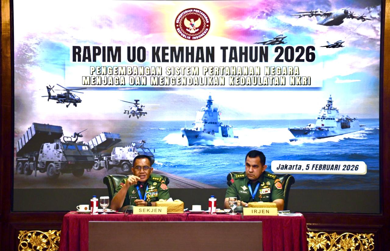 Jakarta – Kementerian Pertahanan Republik Indonesia (Kemhan RI) menggelar Rapat Pimpinan Unit Organisasi (Rapim UO) Kemhan Tahun 2026 yang dibuka dan dipimpin secara langsung oleh Sekjen Kemhan Letjen TNI Tri Budi Utomo serta didampingi oleh Irjen Kemhan Letjen TNI Rui F.G.P Duarte, di Gedung Jenderal Urip Sumohardjo, Kantor Kemhan, Jakarta, pada Kamis (5/2/2026).