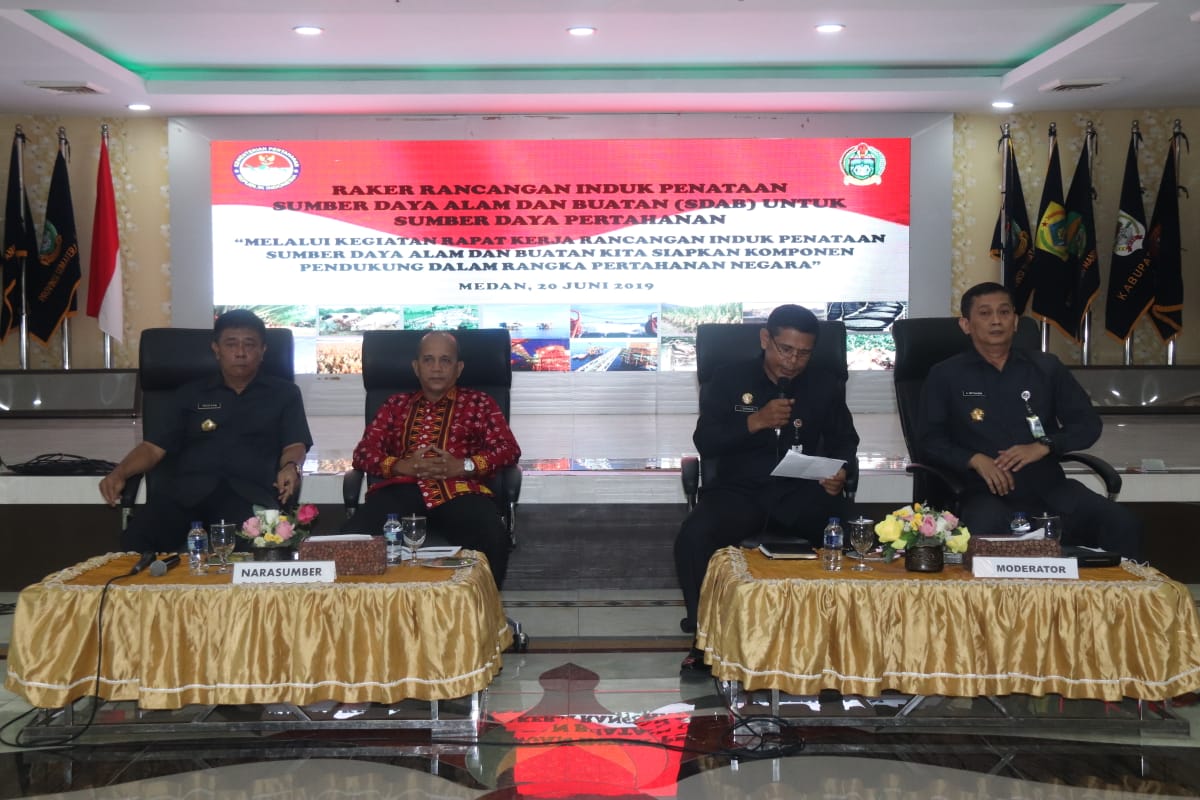Kamis, 20 Juni 2019Kegiatan Rancangan Induk Penataan Sumber Daya Alam dan Sumber Daya Buatan (SDAB) untuk Pertahanan Negara (Hanneg) dilaksanakan pada hari Kamis tanggal 20 Juni 2019, bertempat di Aula Raja Inal Siregar Kantor Gubernur Sumatra Utatra Medan. Kegiatan ini di pimpin oleh Direktur Komponen Pendukung Ir. Tristan Soemardjono, M.M. dihadiri oleh Pejabat Eselon III dan IV di lingkungan Satuan Kerja Perangkat Daerah (SKPD) Provinsi Sumatera Utara. Kegiatan Raker ini mengangkat tema “melalui kegiatan rapat kerja rancangan induk penataan sumber daya alam dan buatan kita siapkan komponen pendukung dalam rangka pertahanan negara “.
