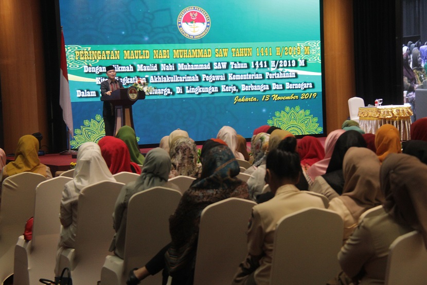 Rabu, 13 November 2019Kementerian Pertahanan Republik Indonesia melaksanakan Peringatan Maulid Nabi Muhammad SAW Tahun 1441/2019 M pada Rabu (13/11/2019) di Aula Gedung Jenderal A.H. Nasution Lt. 16 Jln. Merdeka Barat No.13-14 Jakarta Pusat, dengan tema : “ Dengan Hikmah Maulid Nabi Muhammad SAW Tahun 1441/2019 M, kita tingkatkan Akhlakulkarimah Pegawai Kementerian Pertahanan dalam kehidupan berkeluarga, di lingkungan kerja, berbangsa dan bernegara.” Kegiatan ini dibuka oleh Menhan yang diwakili oleh Irjen Kemhan. Kegiatan ini dihadiri dari Ditjen Pothan Kemhan yaitu Sesditjen Pothan Kemhan Brigjen TNI Aribowo Teguh Santoso, S. T, M. Sc., Pejabat Eselon III, IV dan anggota Ditjen Pothan Kemhan serta seluruh anggota Kementerian Pertahanan RI.