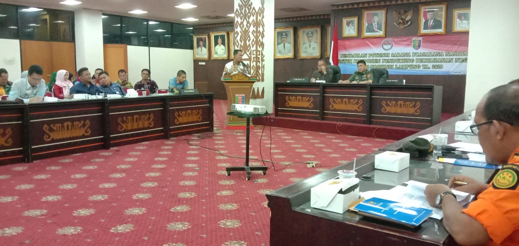 Jumat, 14 Februari 2020 Kementerian Pertahanan melalui Direktorat Jenderal Potensi Pertahanan Sumber Daya Pertahanan menggelar kegiatan Pendataan Potensi Sumber Daya Alam Buatan (SDAB) dan Sarana Prasarana Nasional Untuk Komponen Pendukung Pertahanan Negara, bertempat di Ruang Abung, Balai Keratun pada Kamis (13/2/2020). Kegiatan ini dibuka oleh Staf Ahli Gubernur bidang Pemerintahan, Hukum dan politik Provinsi Lampung Syaiful Darmawan dihadiri oleh Dirjen Pothan Kemhan yang diwakili oleh Kolonel Chb Sarjuno Analis Madya bidang sosial dan seluruh dinas-dinas horisontal yang ada di Provinsi Lampung.