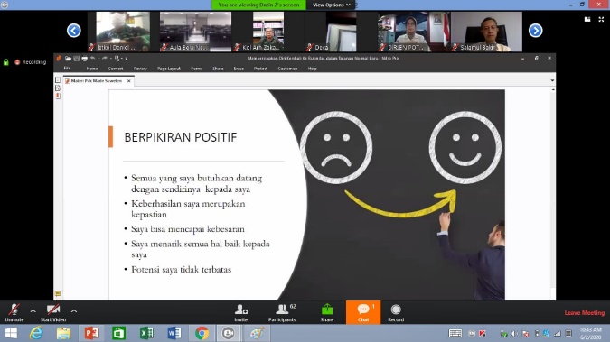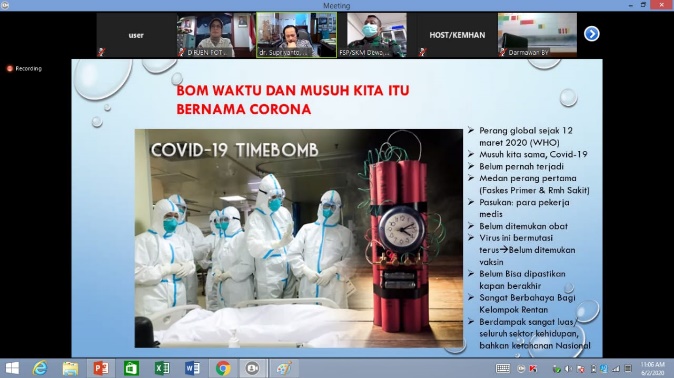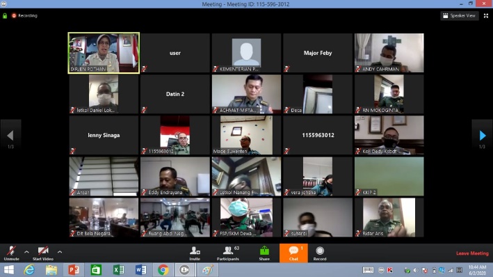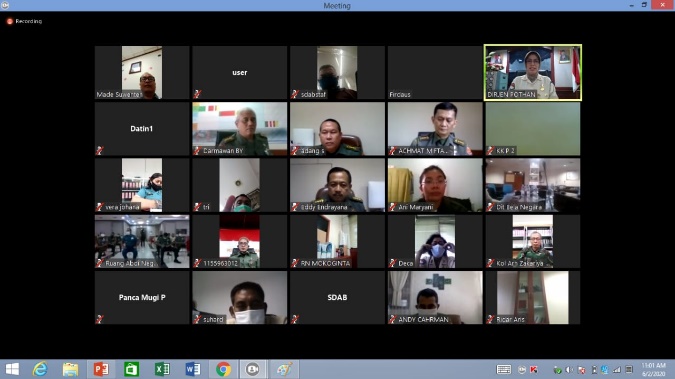 Ditjen pothan Kemhan menyelenggarakan Webinar dengan topik “Persiapan kembali Work From Office (WFO) dalam tatanan normal baru” . Kegiatan ini dimaksudkan untuk memberikan pencerahan kepada seluruh anggota Ditjen Pothan Kemhan dalam hal mengahadapi Covid-19. Bertindak sebagai moderator, Dirjen Pothan Kemhan Prof. Dr. Ir. Bondan Tiara Sofyan, M.Si. yang memandu jalannya kegiatan dan diselenggarakan melalui media online pada Selasa 2 Juni 2020, kegiatan ini mengundang Narasumber pertama Bapak Made Suwenten Dirut HRD Hotel Dharmawangsa dengan tema “Mempersiapkan diri kembali ke rutinitas dalam tatanan normal baru” dan Narasumber kedua dr. Supriyanto, Sp. B.Finacs, M. Kes Direktur RSUD dr. Iskak Tulungagung Jatim Manager Rumah Sakit Terbaik se-Dunia dengan tema “Menyikapi dan bertahan menghadapi Virus Covid-19 dalam tatanan normal baru”.