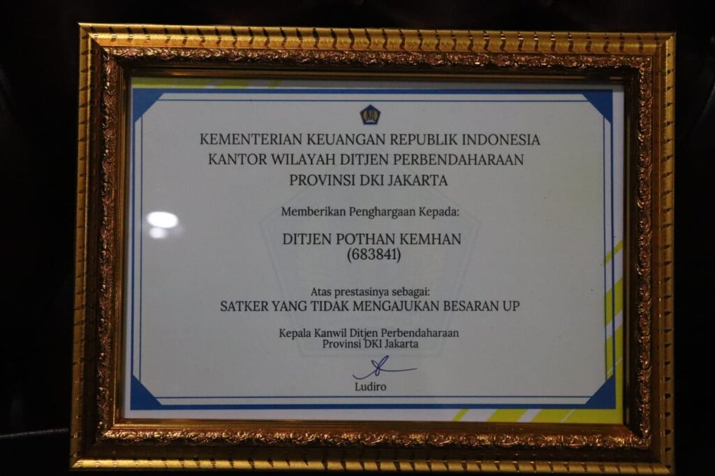 Penghargaan ini membuktikan bahwa Satker Ditjen Pothan Kemhan dapat mengelola keuangan dengan baik tanpa mengajukan kenaikan UP yang telah ditentukan oleh Kementerian Keuangan berdasarkan Peraturan Menteri Keuangan Nomor 143/PMK.05/2018.
