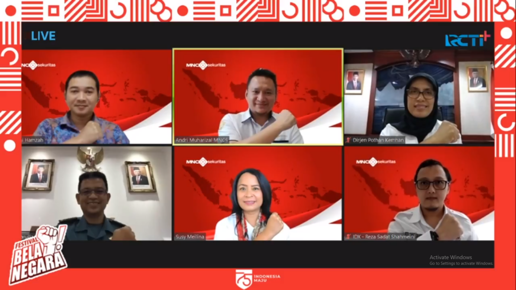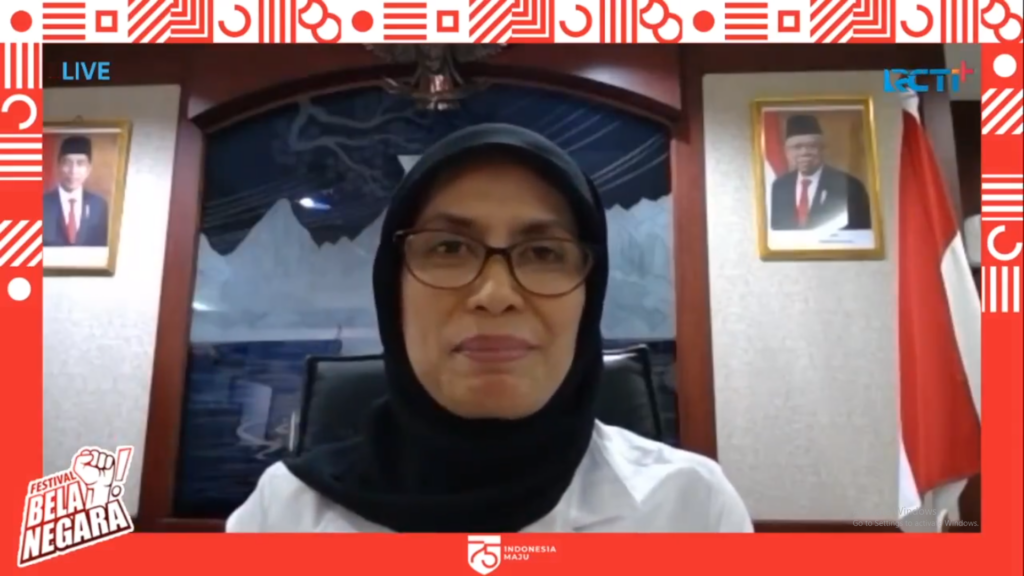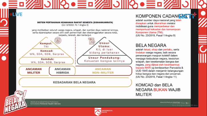 Rabu, 26 Agustus 2020Jakarta Rabu (26 Agst 2020). Dirjen Pothan Kemhan Prof. Dr. Ir. Bondan Tiara Sofyan, M.Si., sebagai Narasumber Webinar Festival Bela Negara “Mahakarya Merah Putih”, dilaksanakan secara Virtual di Livestreaming RCTI.