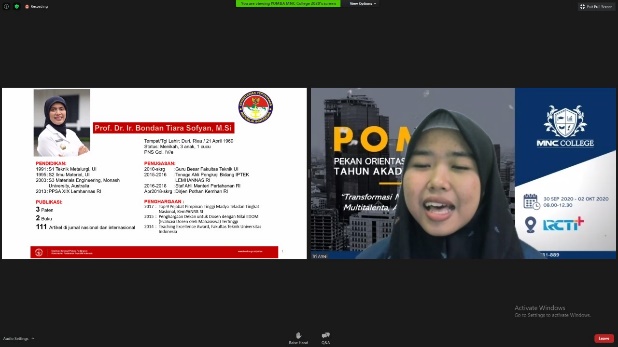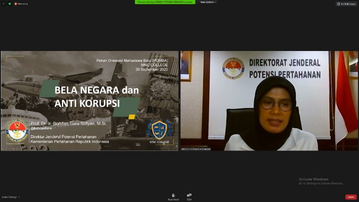 Rabu, 30 September 2020Rabu 30/09/2020 Dirjen pothan Kemhan Prof. Dr. Ir. Bondan Tiara Sofyan, M.Si, hadir secara virtual sebagai narasumber pada kegiatan Pekan Orientasi Mahasiswa Baru MNC College yang dihadiri para narasumber dan peserta Mahasiswa Baru sebanyak 100 orang.