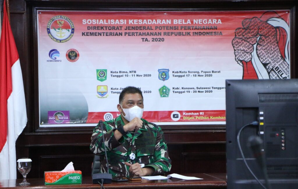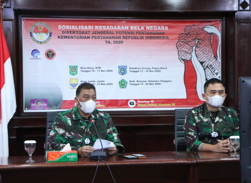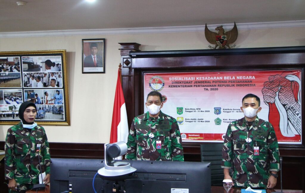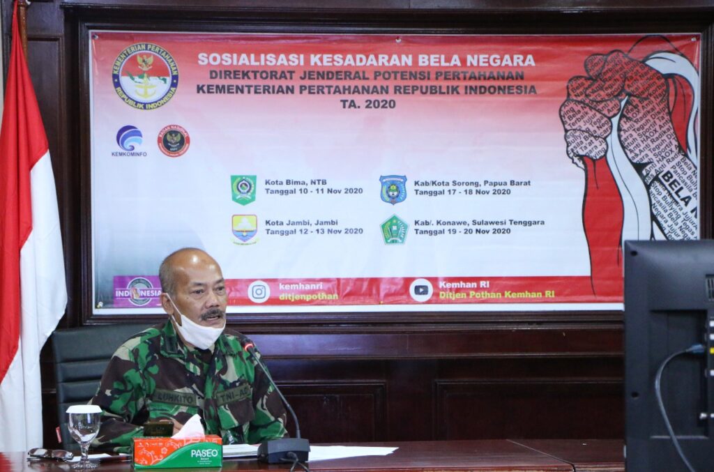 Selasa, 10 November 2020Direktorat jenderal Potensi Pertahanan Kementerian Pertahanan Republik Indonesia menyelenggarakan rangkaian kegiatan sosialisasi kesadaran bela negara di beberapa daerah diantaranya: Kota Bima NTB, Kota Jambi, Kota Sorong dan Kabupaten Konawe. Kegiatan ini dibuka langsung oleh Dirjen Pothan Kemhan Mayor Jenderal TNI Dadang Hendrayudha yang didampingi oleh Direktur Bela Negara Brigjen TNI Jubei Levianto, S. Sos., M.M., dan para Kasubdit Bela Negara Ditjen Pothan Kemhan yang dilaksanakan secara virtual dengan mematuhi protokol kesehatan Covid-19. Sebagai Narasumber adalah: Bapak Ir. Supawarman Kepala Diskominfo Kota Bima dan Bapak Ach. Fathoni, SH. Kepala Badan Kesatuan Bangsa dan Poltik Kota Bima.