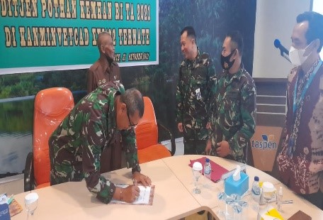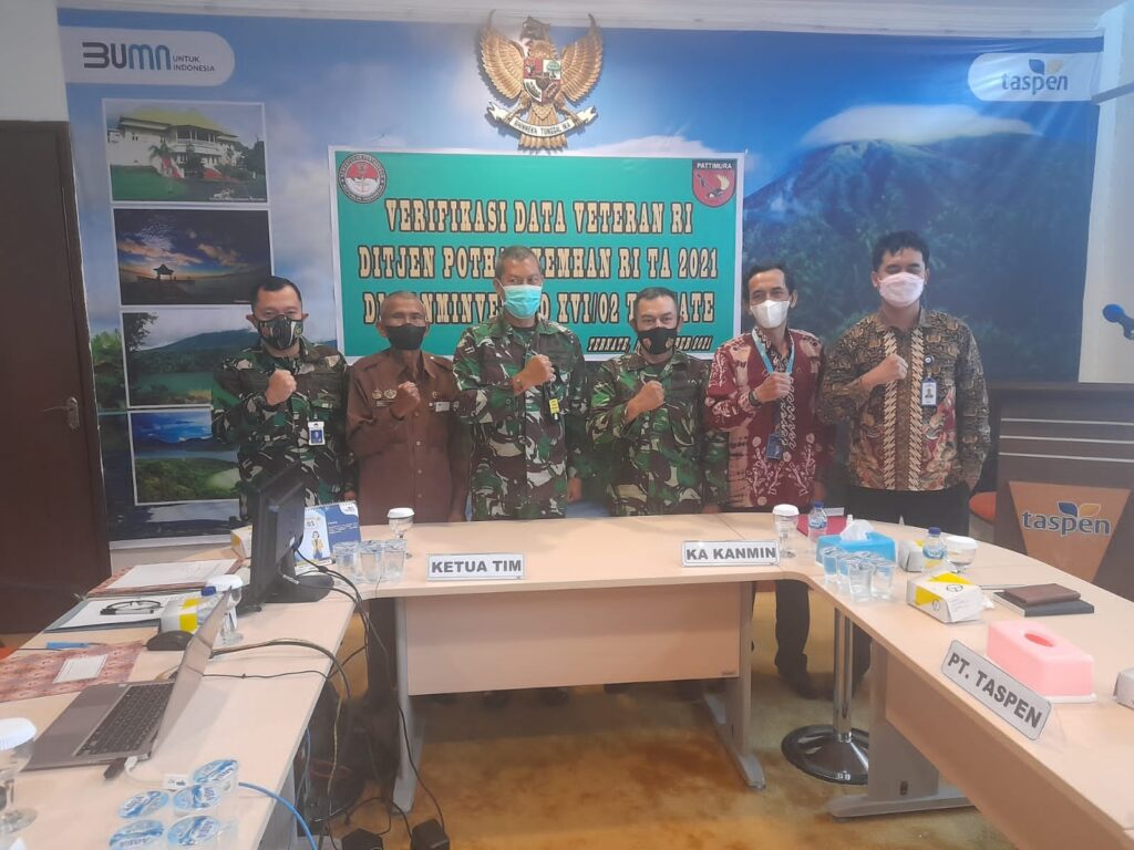Kegiatan Verifikasi Data Veteran Republik Indonesia TA. 2021 di Kanminvetcad XVI/02 Ternate dihadiri oleh Kolonel Laut (P) I Dewa Nyoman Bagus Wibawa, S.E. (Analis Kebijakan Madya Bidang Tahor Ditvet Ditjen Pothan Kemhan), Letkol Chk Hendra Gunawan, S.H., M.Si. (Kasi Inventarisasi Subdit Data Ditvet Ditjen Pothan Kemhan), Mayor Inf Zaitar, S.Ag (Kakanminvetcad XVI/02 Ternate), Mayor (Purn) Mujiono (Ketua DPC LVRI Ternate), Bpk. Burmansyah, S.Kom (Kepala PT. Taspen (Persero) cabang Ternate), Bpk. Tejo Adi Tri Pamungkas (Kepala Seksi Pelayanan dan Kepesertaan PT. Taspen Persero) cabang Ternate).