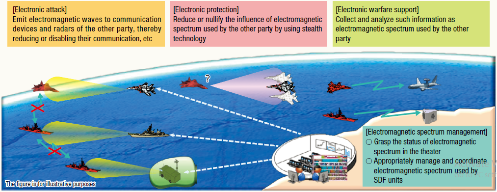 Page 175 Section 4 Alinea 1 berisi “Means or approaches of electromagnetic warfare are generally classified into three categories”. Jepang mengklasifikasikan medan perang elektromagnetik menjadi 3 kategori yaitu electronic attack, electronic protection dan electronic warfare support.