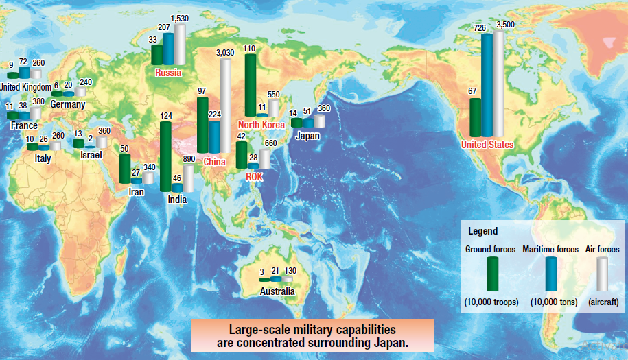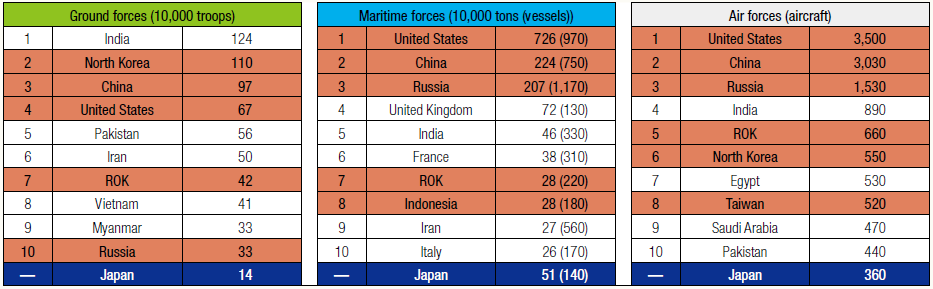 Dalam menjaga keamanan kawasan regional, Jepang melakukan pemetaan kekuatan militer. Hasil pemetaan, kekuatan militer Jepang baik ground, maritim dan air forces ketiganya tidak masuk dalam peringkat 10 besar. Ground forces India menduduki peringkat pertama, sedangkan untuk peringkat pertama maritime dan air forces diduduki oleh Amerika Serikat.