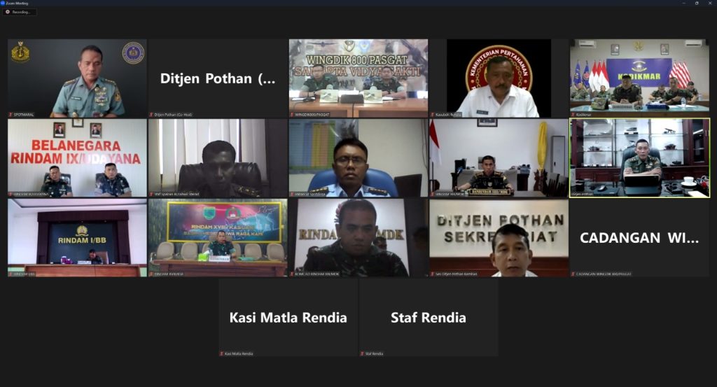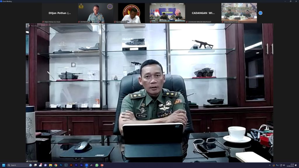 Kamis, 15 Juni 2023Jakarta, 15 Juni 2023. Tugas dan fungsi Ditjen Pothan yaitu menyelenggarakan perumusan dan pelaksanaan dibidang Potensi Pertahanan meliputi sumber daya pertahanan, sumber daya manusia pendukung pertahanan, teknologi industri pertahanan dan teknologi informasi komunikasi pertahanan. Dalam rangka Pembentukan Komponen Cadangan TA. 2023, Ditjen Pothan menyelenggarakan Rapat secara daring tentang Perkembangan Latsarmil Komponen Cadangan. Direktur Jenderal Potensi Pertahanan Kemhan Mayjen TNI Mohammad Fadjar, MPICT. memimpin acara tersebut yang dihadiri oleh para pejabat dari Ditjen Pothan Kemhan, Sterad, Spotmaral, Spotdirga, Rindam I, IX, XIII, XVIII, Kodikmar dan Wingdik 800/Pasgat.