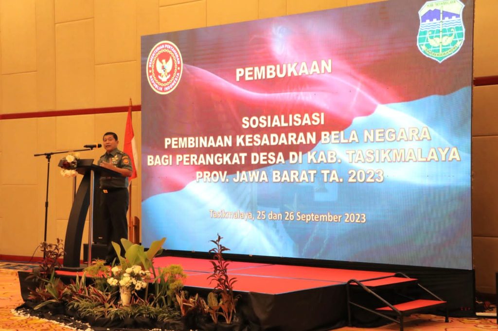 Pada kegiatan sosialisasi diawali dengan pembukaan dan pembacaan sambutan Dirjen Pothan Kemhan Mayjen TNI Mohammad Fadjar, MPICT. oleh Direktur Bela Negara Ditjen Pothan Kemhan Brigjen TNI G. Eko Sunarto, S.Pd, M.Si. serta dilanjutkan pembacaan sambutan Bupati Tasikmalaya oleh Kabankesbangpol Bapak Asep Gunadi, A.Md., S.Sos. Kegiatan ini dihadiri pula dari Ketua DPRD Kab. Tasikmalaya, Bupati Tasikmalaya diwakili Kabankesbangpol Kab. Tasikmalaya, Dandim 0612/Tasikmalaya, Kapolres Tasikmalaya diwakili Waka Polres Tasikmalaya, Kajari Kab. Tasikmalaya diwakili Kasubagbin, Dansatpom, Danbrig R 13/G/1 Kostrad diwakili Kasi Intel Brigrif R 13/G/1 Kostrad, Forkopimda, 250 orang peserta dari perangkat desa dan undangan lainnya.