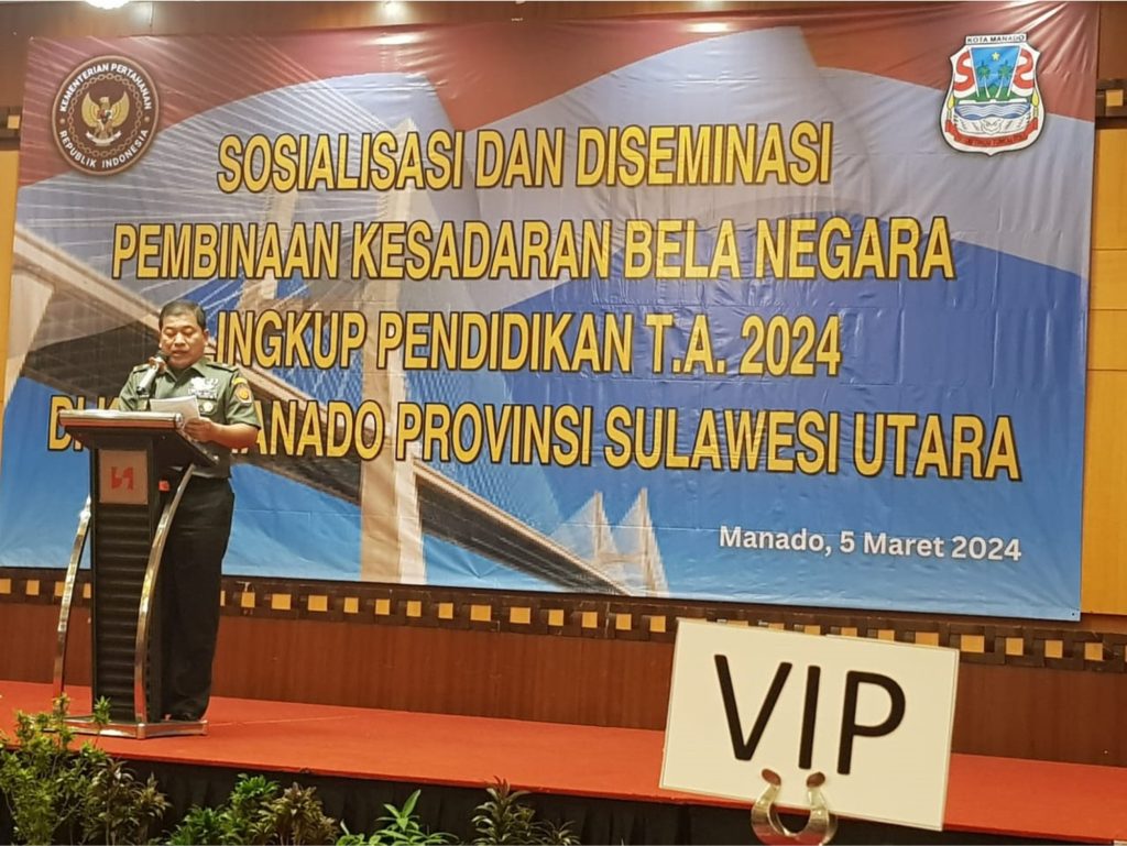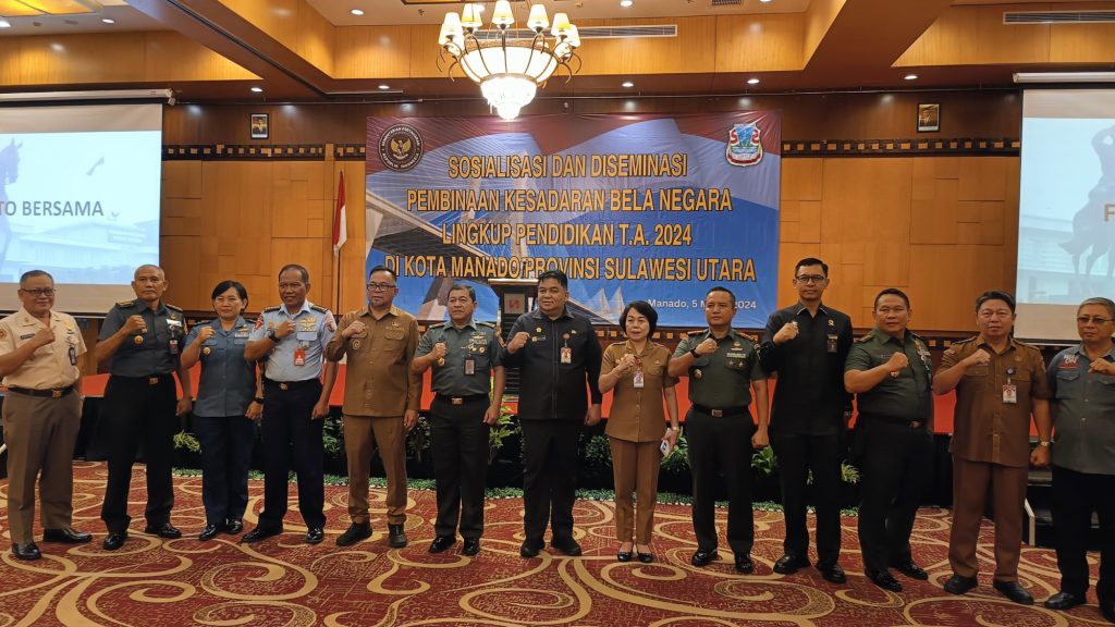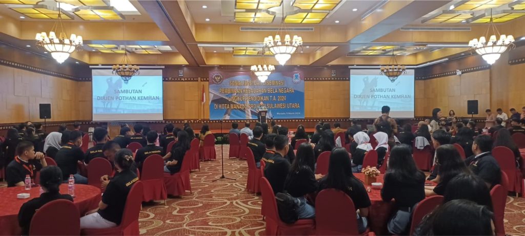 Selasa, 5 Maret 2024Bertempat di Swiss-belhotel Maleosan Manado Sulawesi Utara, Direktur Bela Negara Ditjen Pothan Kemhan RI – Brigjen TNI G. Eko Sunarto, S.Pd., M.Si., memimpin Kegiatan Sosialisasi Pembinaan Kesadaran Bela Negara Lingkup Pendidikan TA. 2024 didampingi Analis Pertahanan Negara (APN) – Pembina Utama Drs. Panca Mugi P. M.M (Han). Hadir pada acara tersebut jajaran pejabat Forkopimda Kota Manado, Kadisdik Provinsi Sulawesi Utara dan Kota Manado. Kegiatan sosialisasi diawali dengan sambutan Dirjen Pothan Kemhan RI yang dibacakan oleh Direktur Bela Negara dan sambutan Walikota Manado yang dibacakan oleh Wakil Walikota Manado – dr. Richard H.M. Sualang.