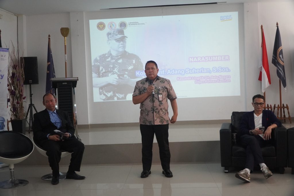 Jumat, 14 Juni 2024Bertempat di Aula Lemondial Business School (LBS) Jakarta, Direktur Bela Negara Ditjen Pothan Kemhan diwakili oleh Kepala Sub Direktorat Lingkungan Pendidikan – Kolonel Inf Adang Suherlan, S.Sos. bertindak sebagai narasumber pada acara seminar kebangsaan. Turut hadir narasumber lain Musisi tanah air – Yosi Mokalu atau Yosi Project Pop dan Ketua Umum Pemuda Pemudi Bela Negara (PPBN) Republik Indonesia – Ary Lestari, S.E., M.Han. Seminar diselenggarakan secara hybrid dengan 100 peserta secara offline dan 80 peserta online (zoom).