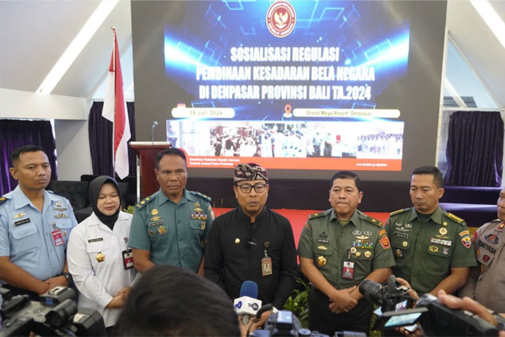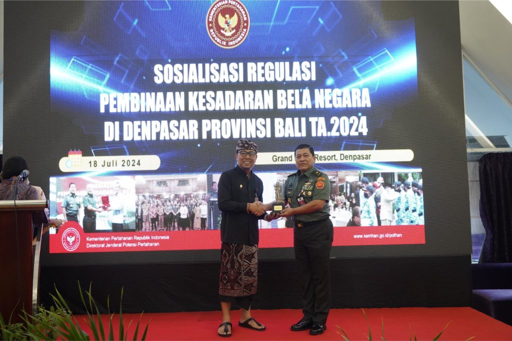 Kamis, 18 Juli 2024Bertempat di Resort Grand Mega Denpasar Provinsi Bali, Direktur Bela Negara Ditjen Pothan Kemhan RI – Brigjen TNI G. Eko Sunarto, S.Pd., M.Si. memimpin kegiatan sosialisasi regulasi Pembinaan Kesadaran Bela Negara (PKBN) didampingi oleh Kasubdit Lingkungan Pekerjaan Direktorat Bela Negara – Dr. Indah Permata S.T., M.M.. Hadir pada acara tersebut Forkompinda Kota Denpasar dan 100 orang peserta.