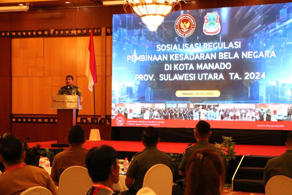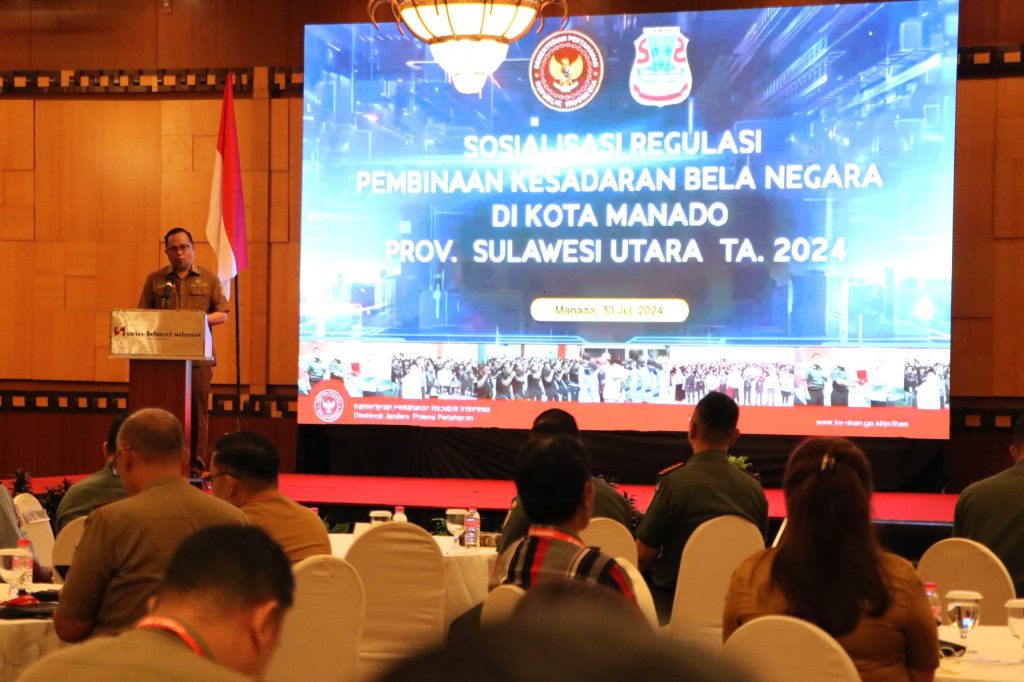 Selasa, 30 Juli 2024Manado, 30 Juli 2024 -Bertempat di Swiss-Belhotel Kota Manado Provinsi Sulawesi Utara, Direktur Bela Negara Ditjen Pothan Kemhan RI – Brigjen TNI G. Eko Sunarto, S.Pd., M.Si. memimpin kegiatan sosialisasi regulasi Pembinaan Kesadaran Bela Negara (PKBN) didampingi oleh Kasubdit Lingkungan Pemukiman (Lingkim ) Direktorat Bela Negara Kolonel Adm Amiruddin Laupe. S.Sos, M.M. Hadir juga pada acara tersebut Forkopimda Kota Manado dan 100 orang peserta.