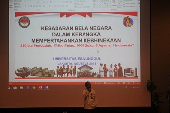Kegiatan Pendidikan Kesadaran Bela Negara (PKBN) pada Pengenalan Kehidupan Kampus Mahasiswa Baru (PKKMB) Tahun 2018 di Universitas Esa Unggul dihadiri…