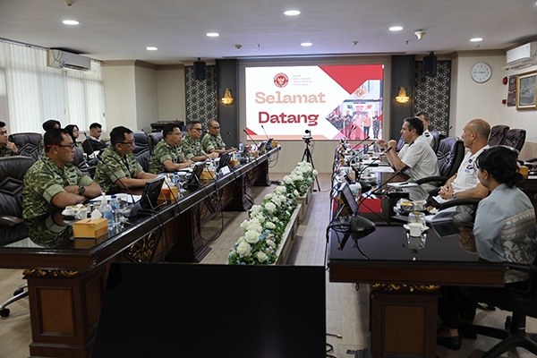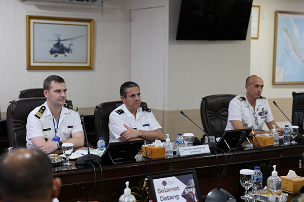 Jakarta, 25/11/2025. Ses Baharwathan mewakili Ka Baharwathan Kemhan, didampingi para pejabat Kapus Baharwathan menerima Brigadier General Le Cam, Director Asia-Pacific, Direction Generale de I’Armament (DGA) Prancis yang didampingi oleh Atase Pertahanan Prancis di Jakarta Colonel Erwant Lintant, Atase Persenjataan Prancis di Jakarta Colonel Benoît Quesson, Staf DGA Ms. Claudia Desk dan Staf Athan Prancis Ms. Yesi Riana.