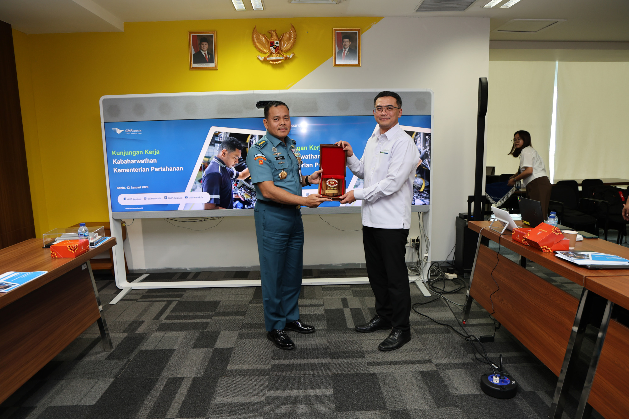 Pada kesempatan tersebut Dirut PT. GMF Aeroasia Bapak Andi Fahrurozie didampingi beberapa Direktur dan Kepala Divisi GMF menerima langsung Kabaharwathan Kemhan dan menjelaskan kemampuan pemeliharaan dan perawatan (Harwat) PT. GMF Aeroasia yang telah mendapat pengakuan secara global, termasuk Harwat Alutsista pesawat TNI berupa Boeing Series, C-130 B/H/HS, Casa-212, dan Bell 412, dan saat ini dalam proses pengembangan kemampuan Harwat Pesawat C-130J, AS332 Superpuma, Falcon 8X, dan A400M.