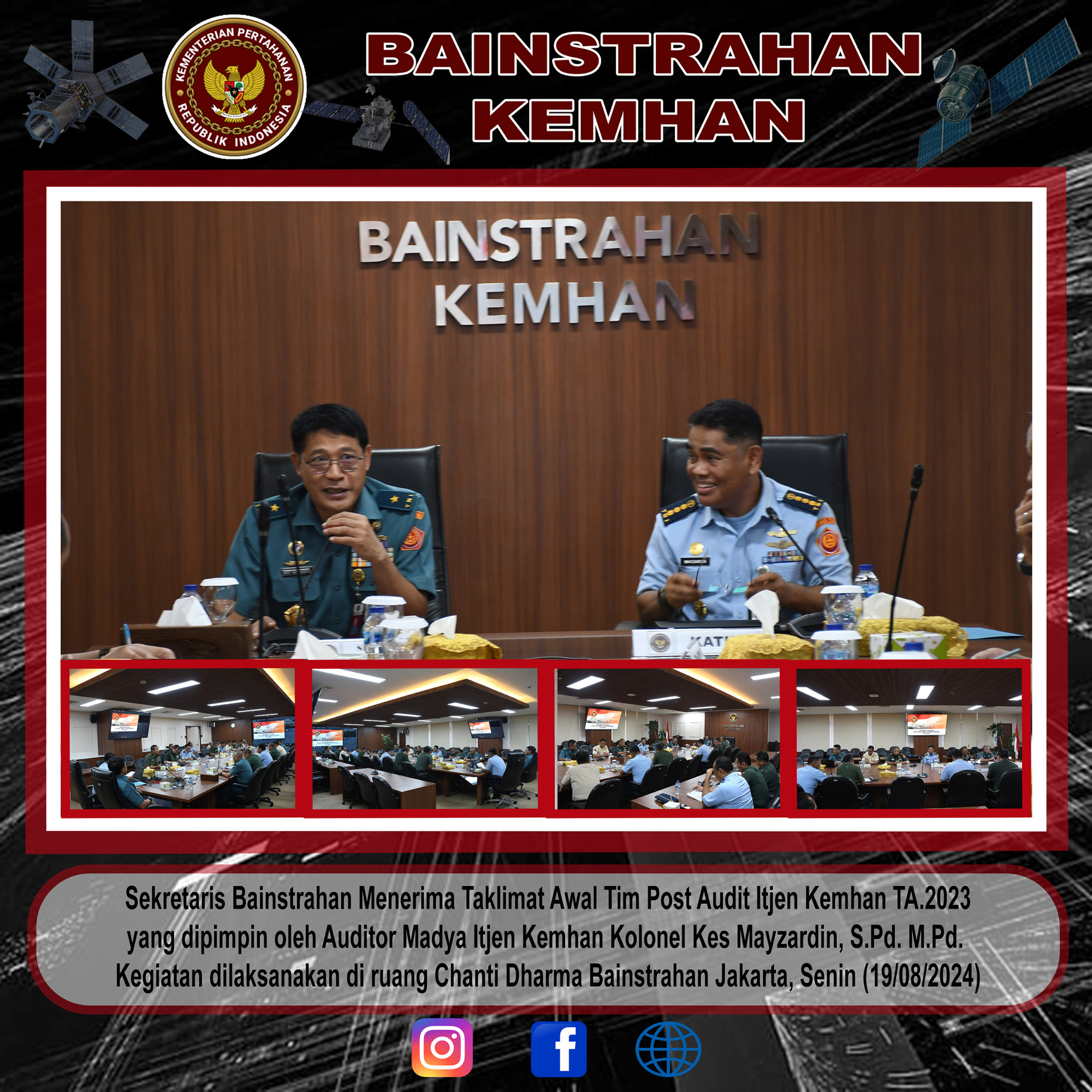 Sekretaris Bainstrahan Laksma TNI Dr. Arif Harnanto, S.T., M.Eng., mewakili Kabainstrahan Kemhan Mayjen TNI Robi Herbawan, S.E., membuka taklimat awal Post audit kinerja Inspektorat Jenderal Kemhan RI di Bainstrahan Kemhan, bertempat di ruang Chanti Dharma Bainstrahan, Senin (19/08/2024).