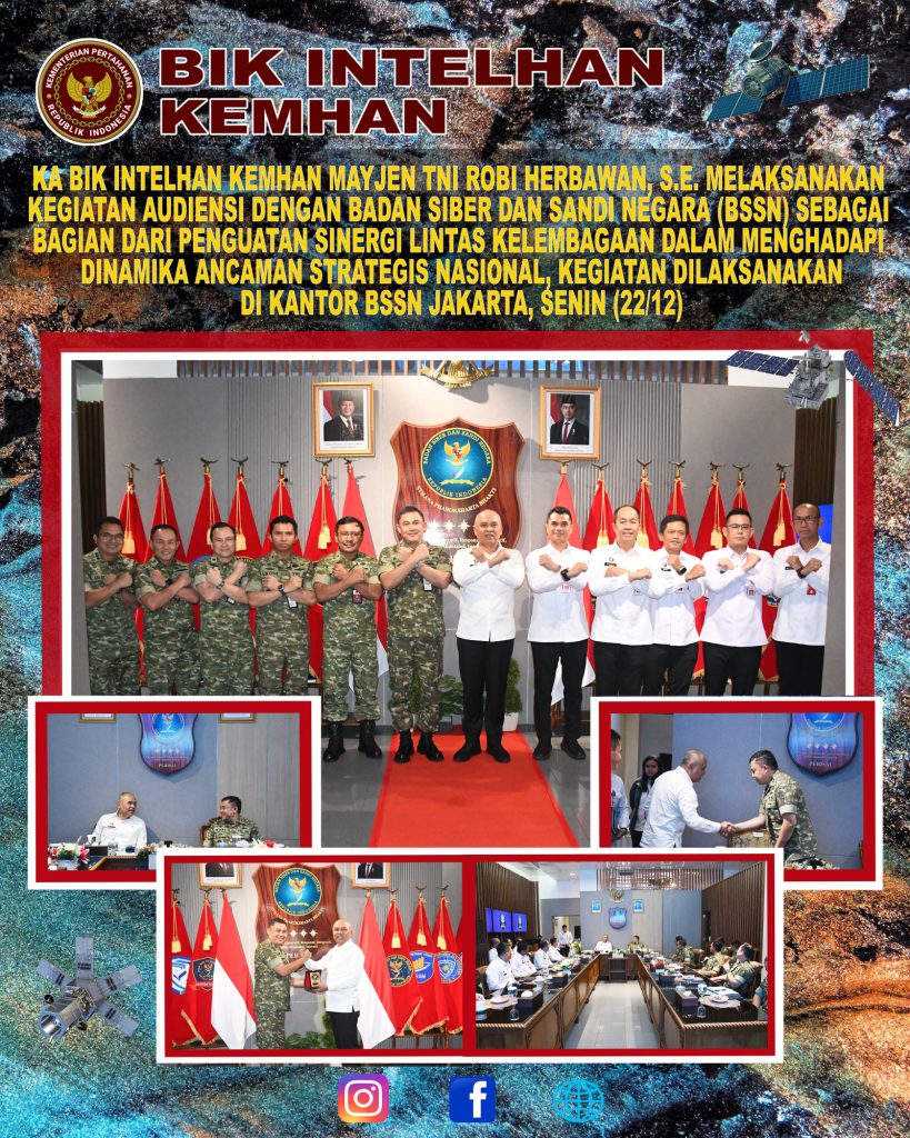 Kepala Badan Informasi dan Komunikasi Intelijen Pertahanan Kemhan RI Mayjen TNI Robi Herbawan, S.E. melaksanakan kegiatan audiensi dengan Badan Siber Dan Sandi Negara (BSSN) sebagai bagian dari penguatan sinergi lintas kelembagaan dalam menghadapi dinamika ancaman strategis nasional.