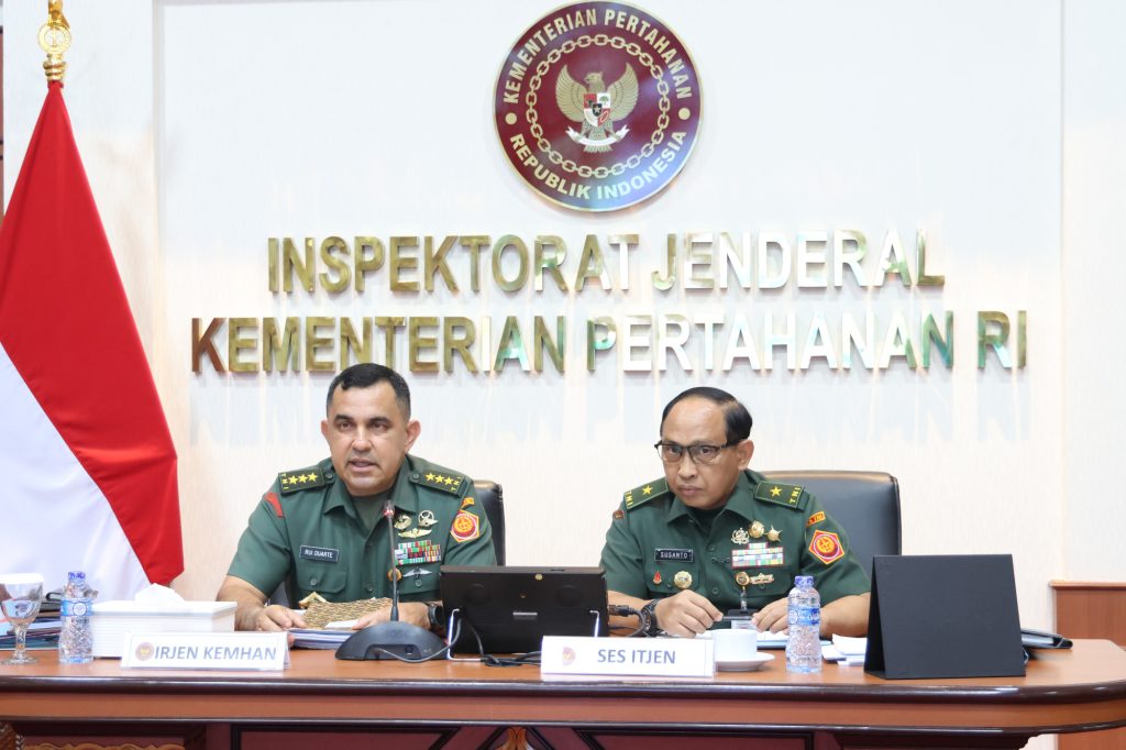 Senin, 8 Desember 2025Inspektur Jenderal Kementerian Pertahanan (Irjen Kemhan) Letjen TNI Rui F.G.P Duarte memimpin rapat evaluasi audit bulan November 2025 pada Rumah Sakit BLU TNI di ruang rapat Itjen Kemhan Jakarta, pada Senin (8/12/2025). Rapat ini menjadi bagian upaya penguatan akuntabilitas pelaksanaan program prioritas Kementerian Pertahanan untuk mengevaluasi pelaksanaan kegiatan pengawasan internal Itjen Kemhan periode bulan November 2025.