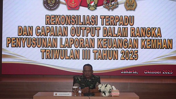 Kapuslapbinkuhan Kemhan, Brigjen TNI Delvi, S.I.P.,M.Si.,CFrA, pada hari Rabu (15/10) membuka rapat Rekonsiliasi Terpadu (Ren, BMN, Keu) dan Capaian Output dalam rangka Penyusunan Laporan Keuangan Kemhan Triwulan III TA. 2025, di rupat Puslapbinkuhan Kemhan Gd. A.H. Nasution Lt. 16 Kemhan. Hadir pada kesempatan tersebut Auditor Itjen Kemhan, para Kabag dan Kabid di jajaran Kemhan para pejabat BMN, Logistik dan Keuangan Unit Organisasi, serta pejabat dan staf dari Kemkeu.