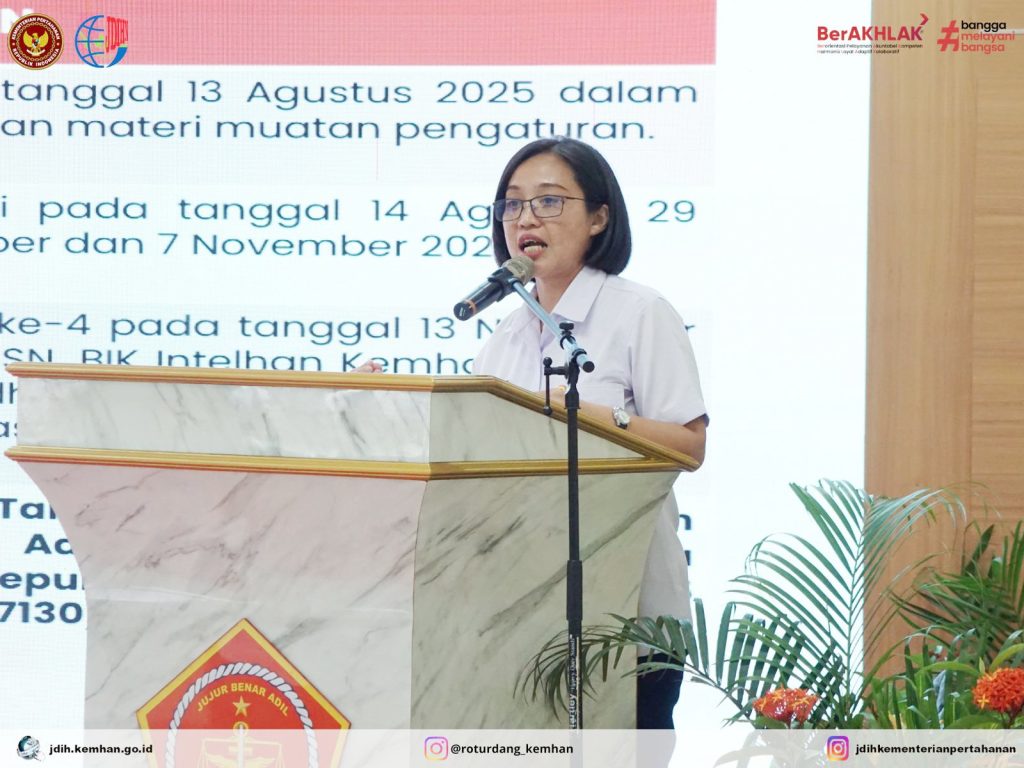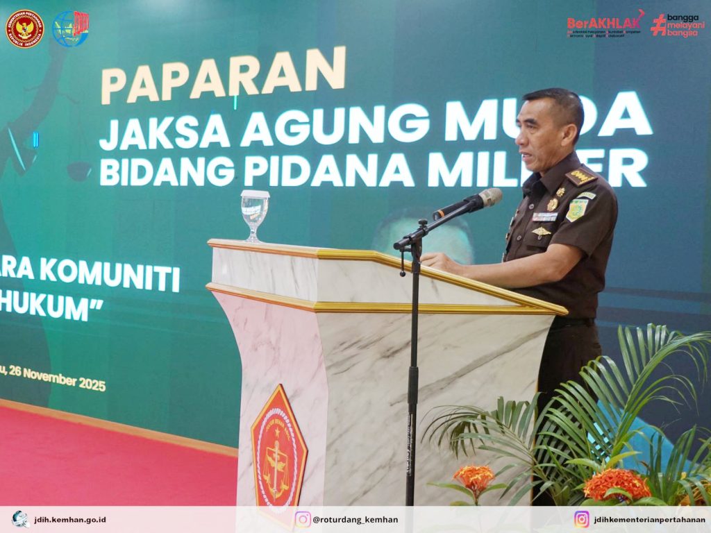 Kepala Biro Peraturan Perundang-undangan Sekretariat Jenderal Kementerian Pertahanan, Sri Sulastiyani, S.H., M.H., menghadiri Pertemuan Komunitas Hukum di lingkungan Tentara Nasional Indonesia pada Rabu, 26/11/2025 di Aula Otmilti II Jakarta. Pertemuan Komunitas Hukum dibuka oleh Kepala Badan Pembinaan Hukum (Kababinkum) TNI, Laksda TNI Farid Ma’ruf, S.H., M.H.,. Dalam pertemuan tersebut narasumber menyampaikan paparan mengenai isu-isu menonjol di bidang hukum. Adapun narasumber yang hadir dari Itjen TNI, Biro Peraturan Perundang-undangan Kemhan RI, Jampidmil, Babinkum TNI, Ditkumad, Diskum AL, dan Diskum AU.