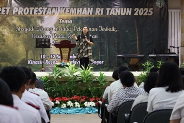 Jumat, 12 September 2025Bogor – Umat Kristen Protestan Kementerian Pertahanan (Kemhan) RI menggelar kegiatan Retret di Kinasih Resort & Conference, Bogor, pada 10 – 12 September 2025. Kegiatan yang diikuti 550 peserta, terdiri dari pegawai Kemhan yang diantaranya terdapat 17 peserta dari Ditjen Strahan Kemhan, para dosen serta mahasiswa Universitas Pertahanan RI (Unhan). Turut hadir dalam kegiatan tersebut Penasehat Umat Protestan Kemhan Marsma TNI Lambok M. Sormin, serta Wakil Dekan I Bidang Akademik dan Kemahasiswaan FTTP Unhan RI Marsma TNI Sovian Aritonang.